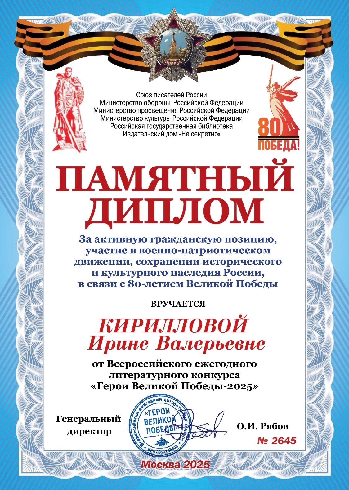 Всероссийский ежегодный литературный конкурс "Герои Победы -2025" проводится уже 9 лет. Он проходит под девизом: "В каждой строчке-память! В каждом имени-герой!" В Конкурсе участвуют специалисты в области воспитания, граждане Российской Федерации в возрасте от 18 (восемнадцати)...