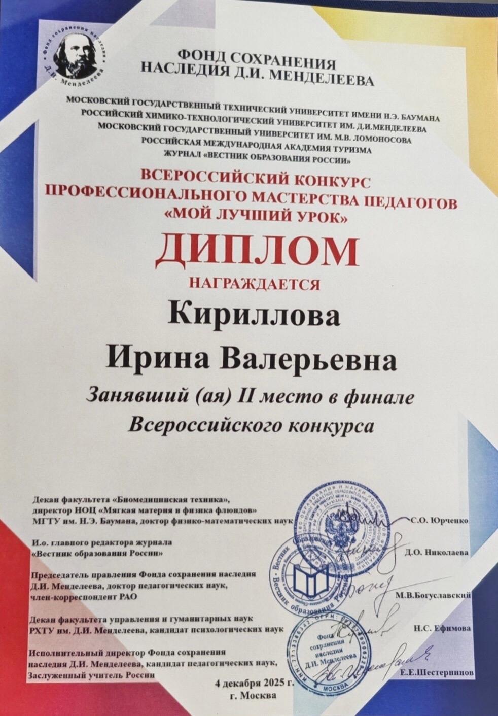 2 декабря 2026 года в Москве состоялся Всероссийский конкурс профессионального мастерства педагогов "Мой лучший урок", в котором приняла участие Кириллова И.В, учитель русского языка и литературы высшей категории, методист, педагог-наставник БОУ города Омска "СОШ №77" с темой...
